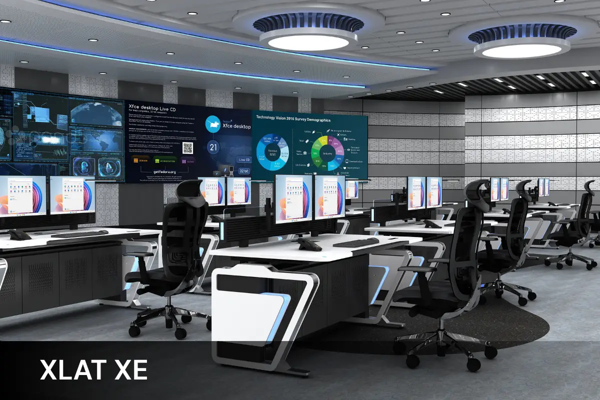 A selection of future-ready control room consoles including XLAT ZE, XLAT SE, Centre Hub, Video Wall, and C-Shape Wall, designed for airports, defense, utilities, and smart cities.